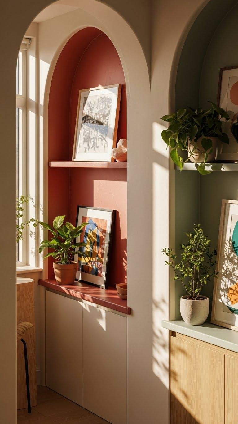 You’ll frame art or plants with arched shelving, paint interiors in bold or muted hues, and enjoy the liberated, sculptural feel. Rounded jambs finish the look, keeping passages smooth and surprisingly modern for small, free-spirited apartments.