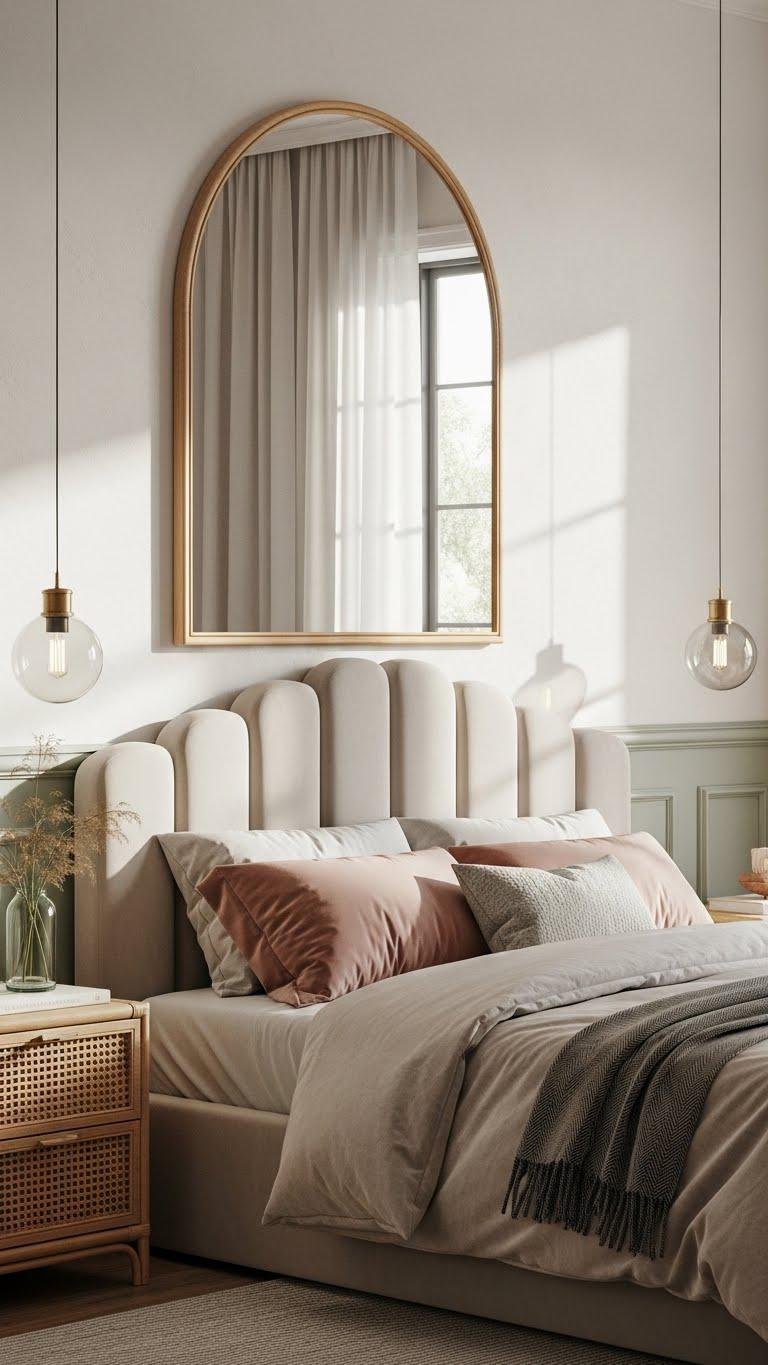 If you want a soft, on-trend update, add an arched mirror and a scalloped headboard to introduce gentle curves that counteract angular furniture and hard lines. You’ll create airy depth, bouncing light and making rooms feel larger. Choose natural frames or pastel upholstery for a liberated, calm vibe.
