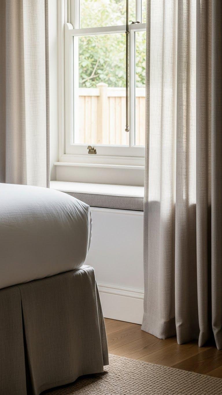 Bring in pleated skirting or cafe curtains to soften straight lines and add a tailored, textural pause to your windows or bed base. You’ll choose pleated valances for structured elegance or airy cafe panels for a breezy, lived-in vibe.