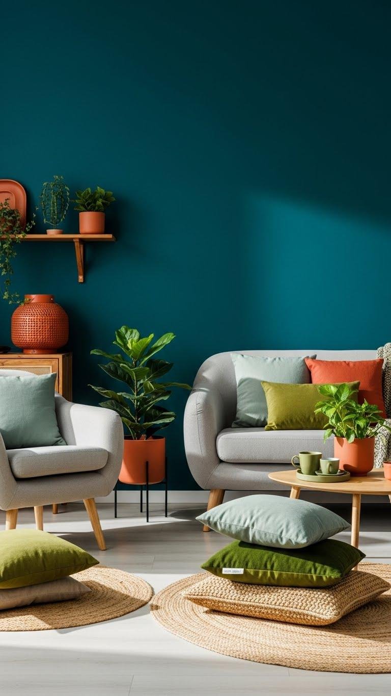 Play with color relationships to create rooms that feel both curated and effortless: pair complementary hues—like deep teal with warm terracotta—for bold contrast, or layer analogous tones—think soft sage, moss, and olive—for a calmer, cohesive vibe. You’ll use complementary contrasts to energize a focal wall and introduce analogous accents through textiles and plants, keeping palette choices intentional and freely expressive.