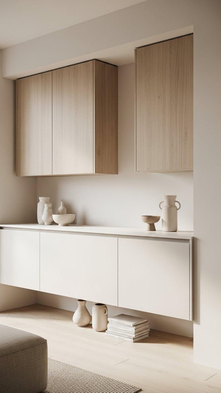 Treat lower cupboards like a floating cabinet, accenting negative space with sculptural décor so the room feels unpinned and free.