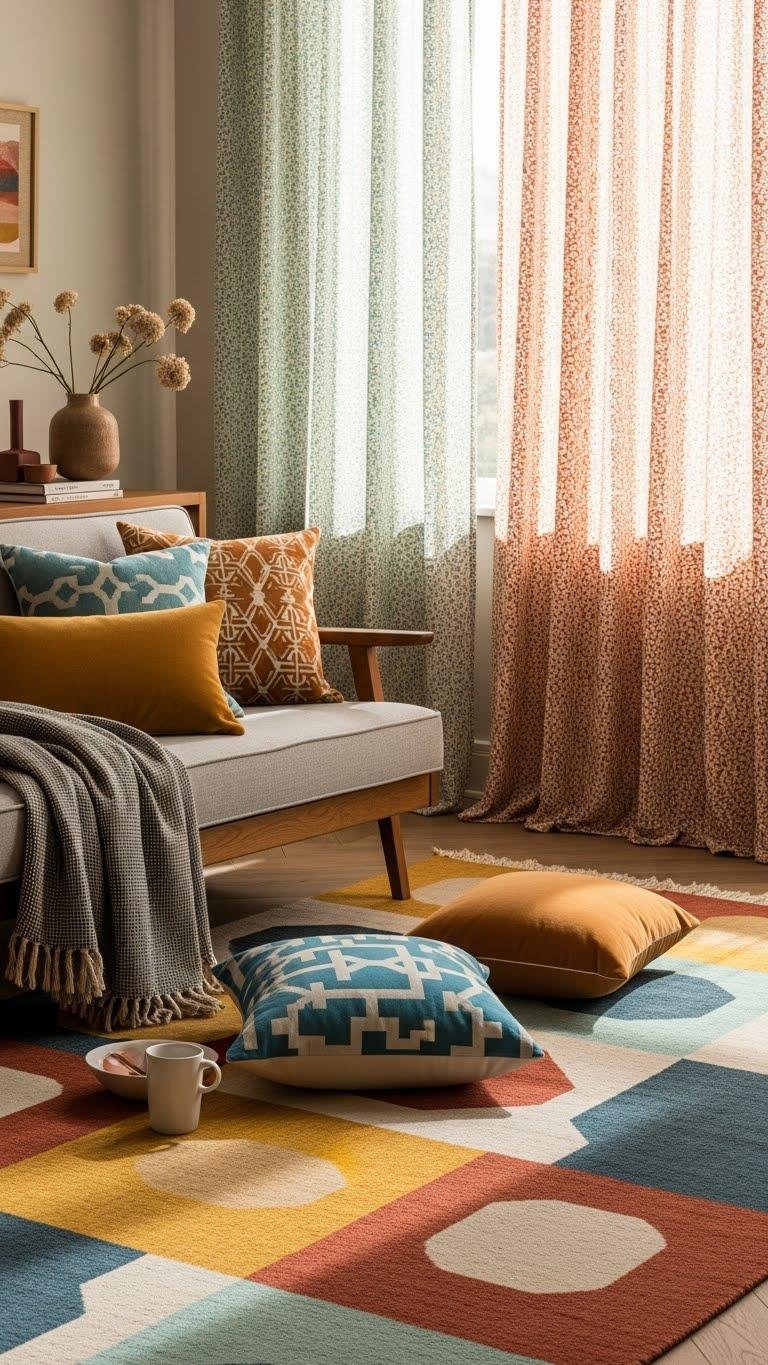 You’ll layer a bold throw, cushions and curtain in coordinated fabric, then introduce a subtler checked rug to echo pattern scale.