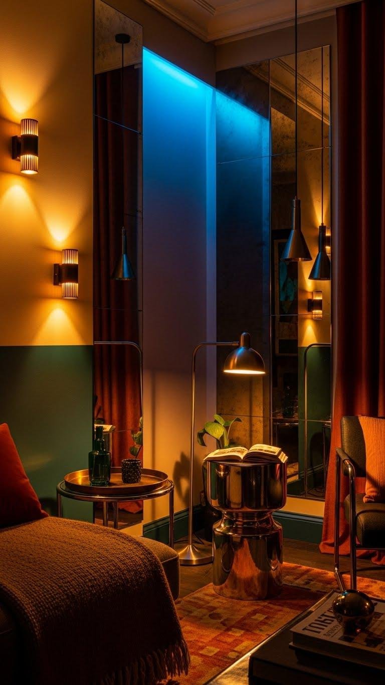 Use layered sconces to sculpt shadows, pendants for drama, and mirrored panels to bounce light into corners. Swap bulbs to shift mood, angle reflective art toward seating, and let light amplify your palette for a freer, bolder vibe.