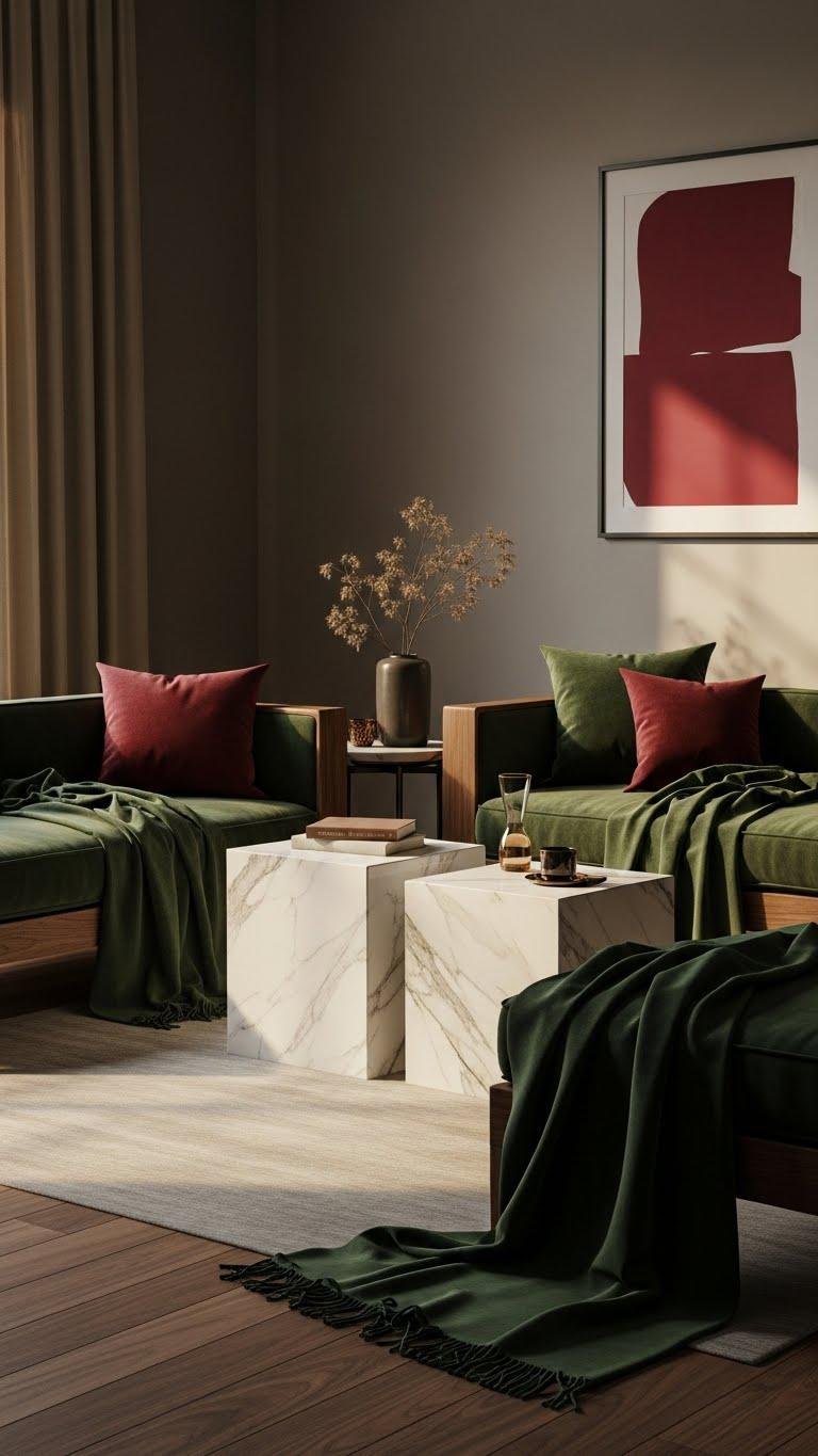 Although bold, pairing dark green and burgundy feels unexpectedly modern when you balance intensity with texture and scale.