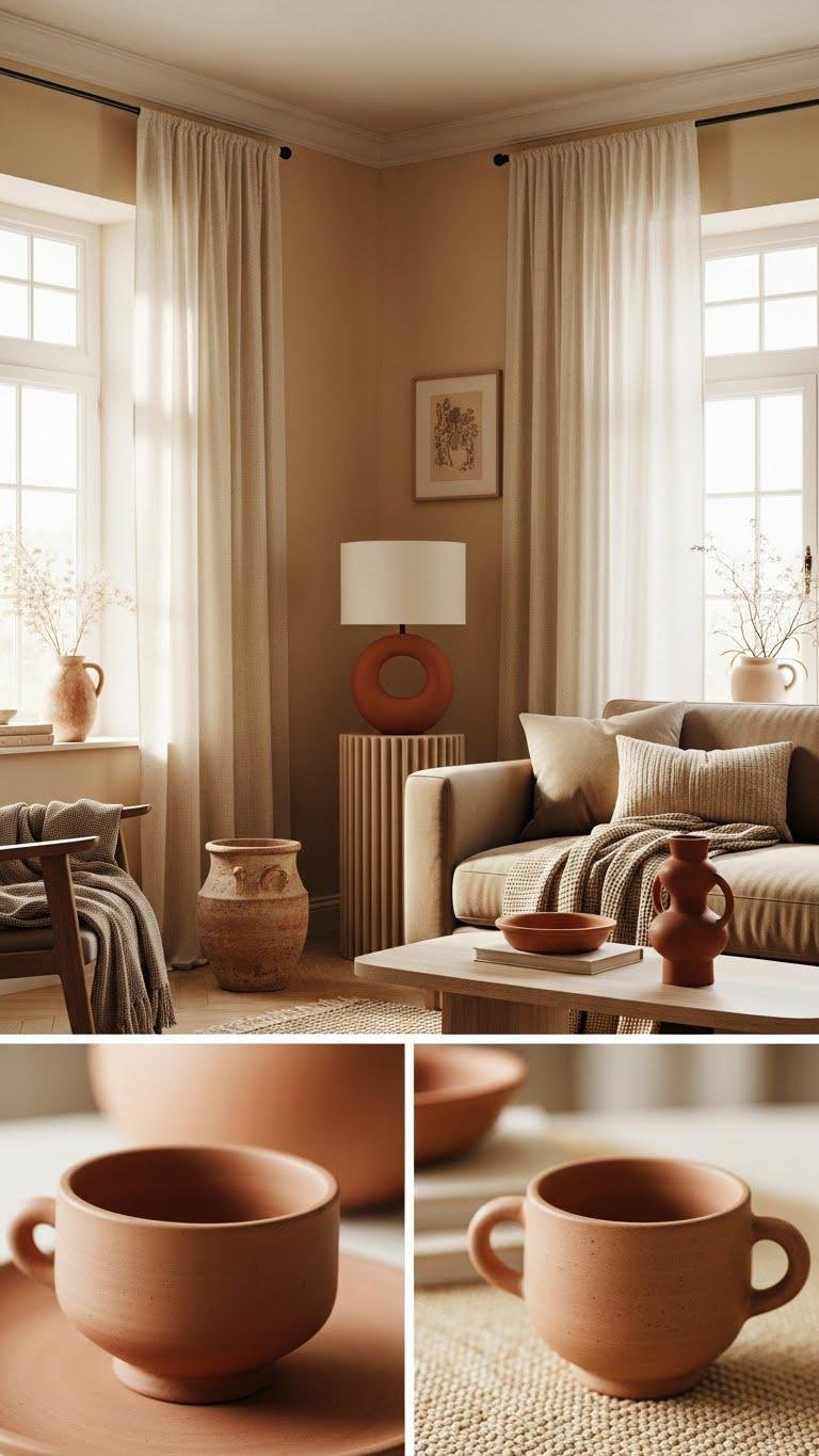 Moving from a moody green-and-burgundy scheme, anchor your room in warm neutrals—think honeyed beige, soft taupe, and sunlit cream—so bold colors pop without overwhelming the space. You’ll use sunset neutrals as a calm canvas, then introduce terracotta accents in pottery, throws, or a sculptural lamp. Keep lines clean, let color breathe, and choose pieces that feel liberating and intentional.