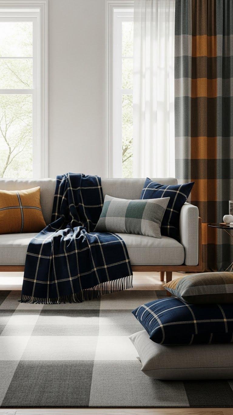 Often you’ll see checks reworked in coordinated colorways to give a room rhythm without feeling fussy.