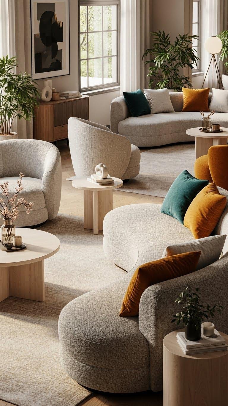 Rounded silhouettes soften a room’s edges and make your space feel more inviting and modern. Choose curved silhouettes for sofas, chairs, and side tables to break rigid lines and promote flow. You’ll want soft upholstery in neutral or bold tones to encourage lounging and easy movement. Rounded furniture lets you express freedom while keeping interiors chic, cozy, and effortlessly contemporary.