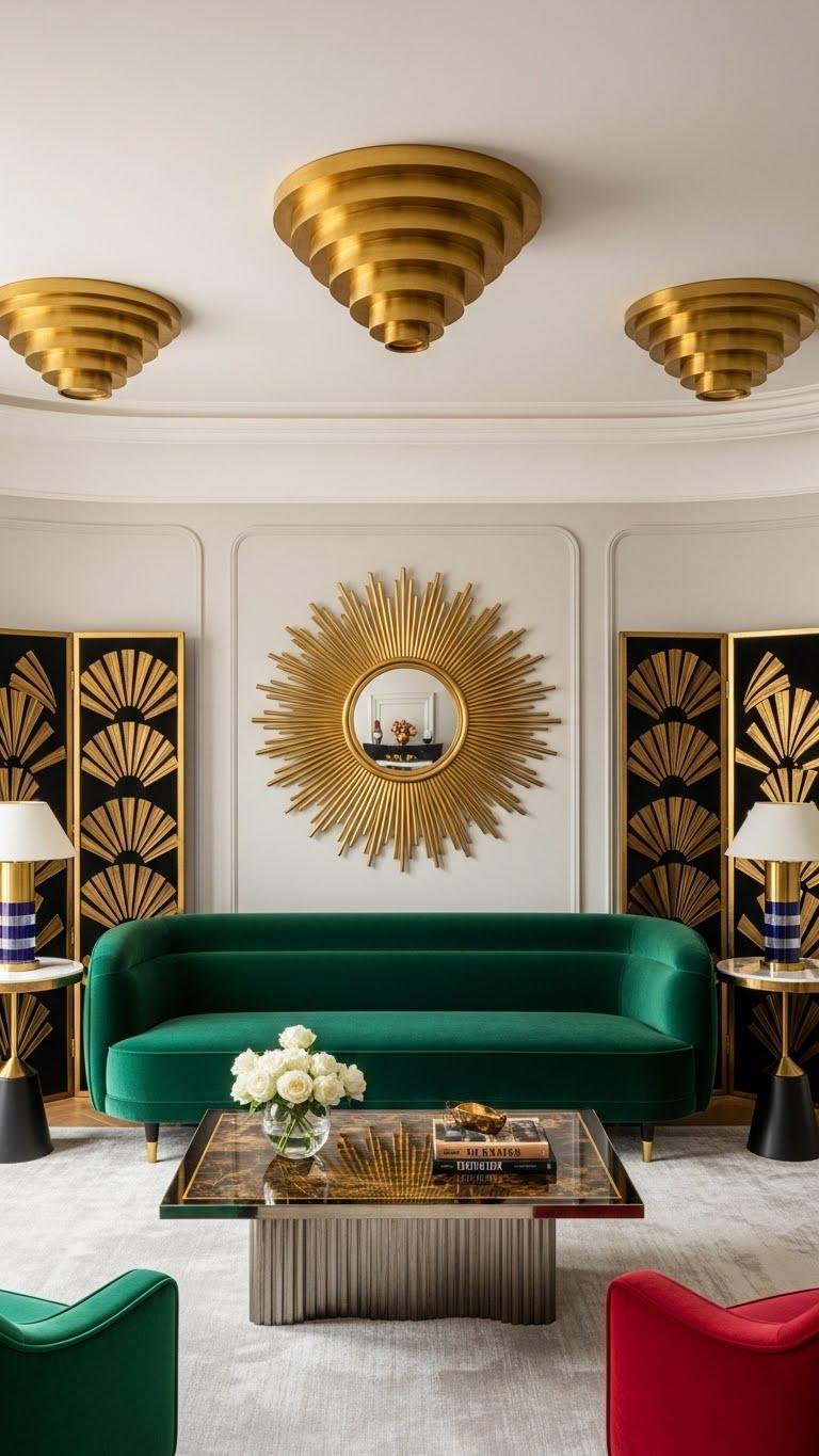 After soft curves set the tone, bring in Art Deco pieces to add glamour and geometric drama. You’ll choose bold mirrors, sculptural lighting, and streamlined furniture that feels liberated. Mix metallic accents with deep jewel tones, introduce fan motifs in screens or art, and let symmetry create confident focal points. Keep it curated so your space breathes and dazzles without clutter.