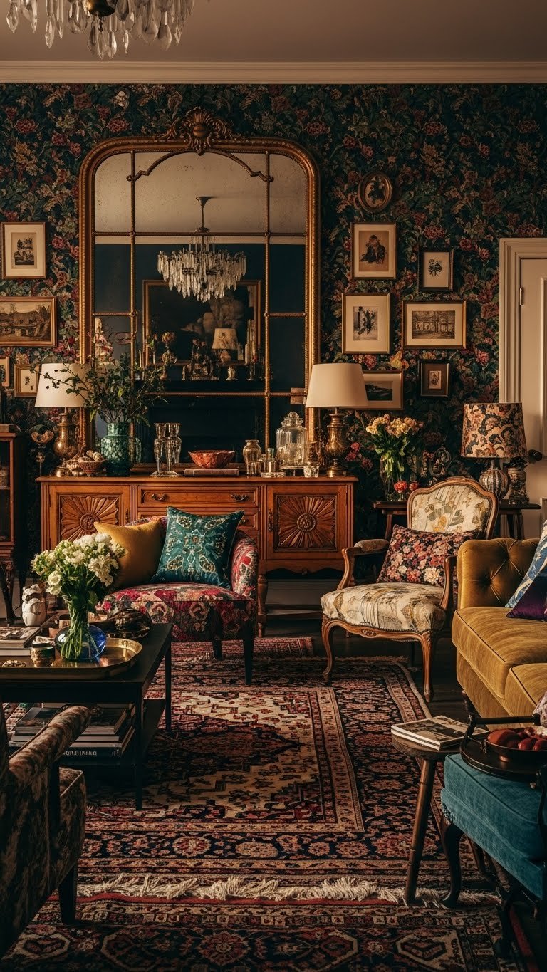 You’ll balance antique mirrors as focal points against patterned wallpapers, mixing scale and texture confidently.
