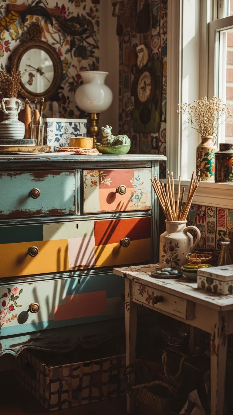 After layering patterned wallpapers and collected objects, handpainted furniture offers a way to personalize the chaos with intention. You’ll choose pieces that speak to you, blending distressed finishes with bold color or soft floral motifs for contrast.