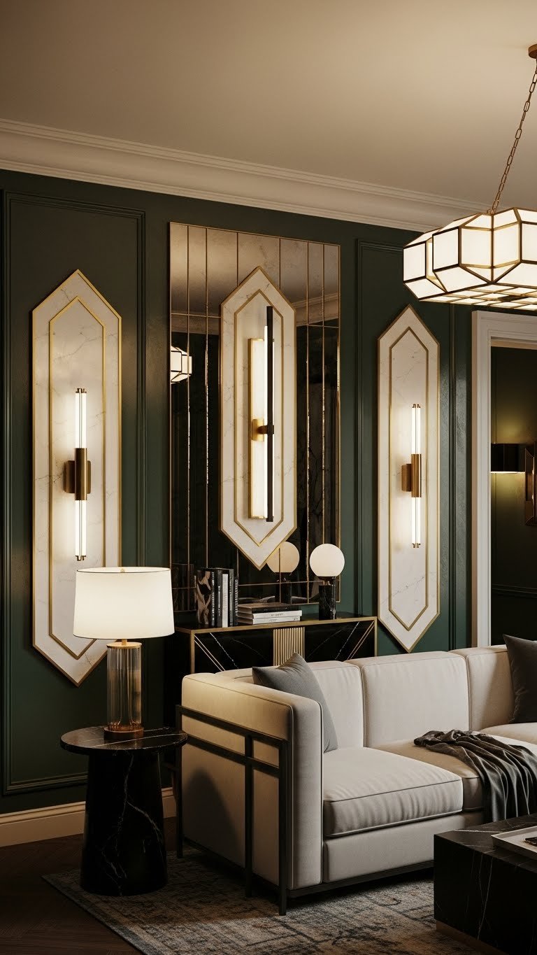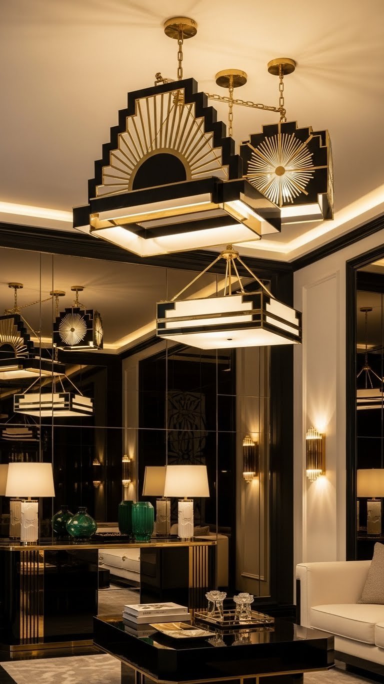 Make a bold choice with Art Deco statement lighting to give your room instant structure and glamour. You’ll select geometric pendants that anchor space while reflecting personality. Pair them with mirrored surfaces, bold metallics and lacquer finishes for depth and sleek contrast. Position fixtures to sculpt sightlines; layer ambient and accent light. The result feels liberated, curated and unapologetically confident.