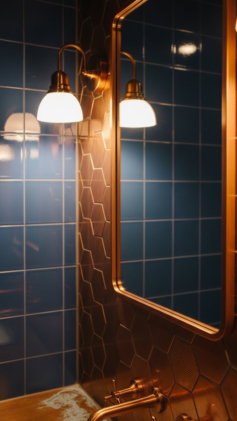 You’ll choose hex tile accents, use textured grout for depth, and select mirror framing that complements copper’s sheen.