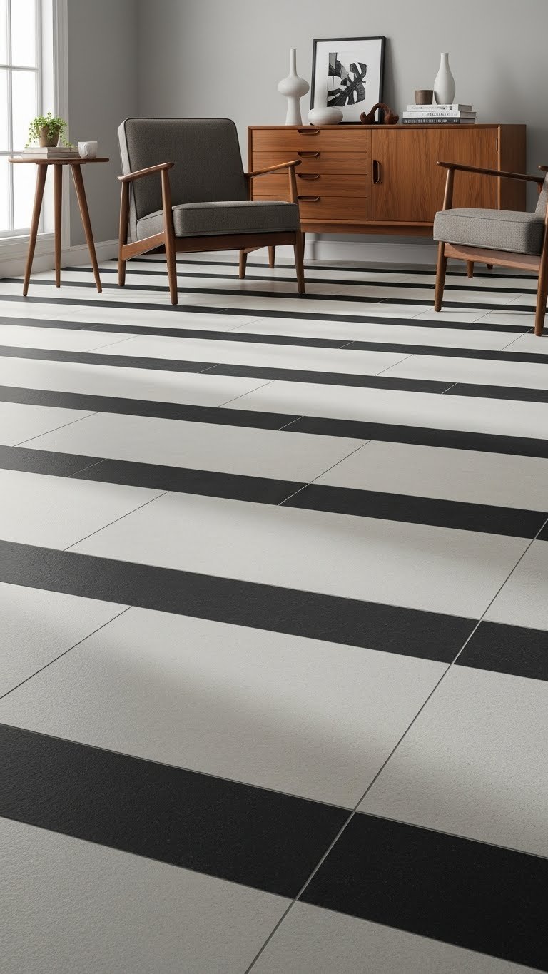 Striped floors set a bold geometric tone, and visible-joint tile installations carry that same graphic energy into grout lines and patterning. You’ll embrace exposed groutlines and visible seams as deliberate design, using contrast or subtlety to define rhythm.