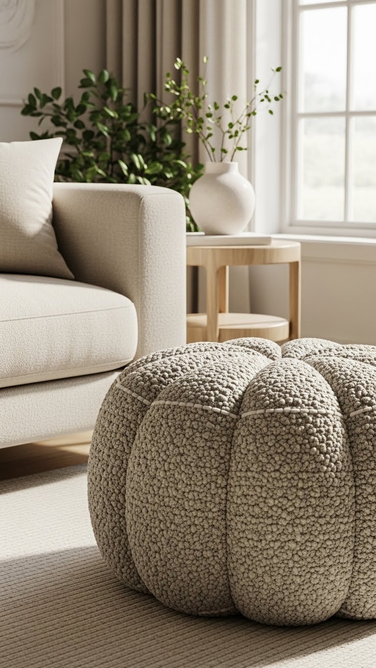 You’ll lean into relaxed luxury by pairing a neutral sofa with a bouclé pouf or boucle ottoman for flexible seating and sculptural contrast. Choose durable blends, simple lines, and low-maintenance colors to keep rooms airy, inviting, and effortlessly free.