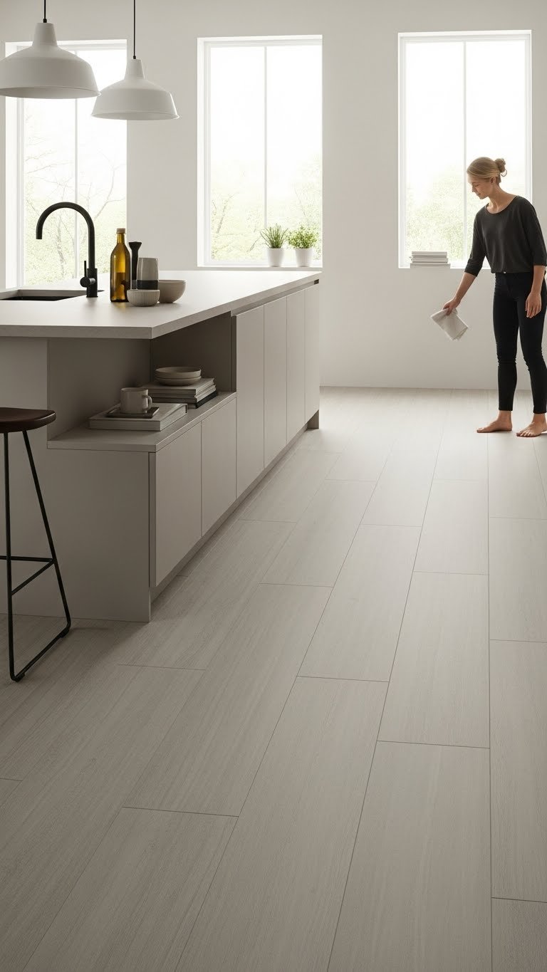 You’ll love how large format porcelain planks minimize grout lines, cut cleaning time, and extend a minimalist vibe.