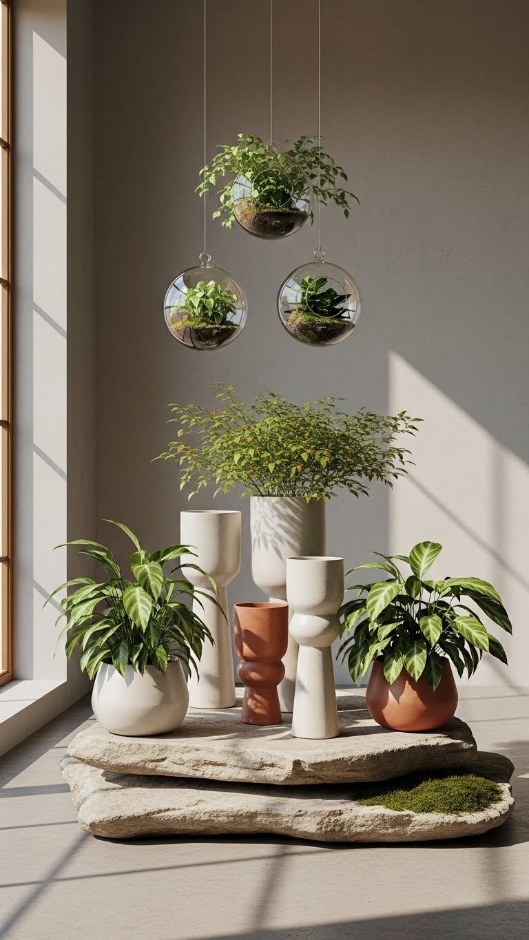 Natural stone sets a grounded stage, and indoor greenery gives that stage movement and life—softening hard edges while reinforcing a calm, elemental palette. You’ll layer freedom with hanging terrariums for airiness and sculptural planters as living art. Choose resilient foliage, vary heights, and mix textures to create effortless rhythm. Maintain simple care routines so plants remain vibrant, liberating your space.