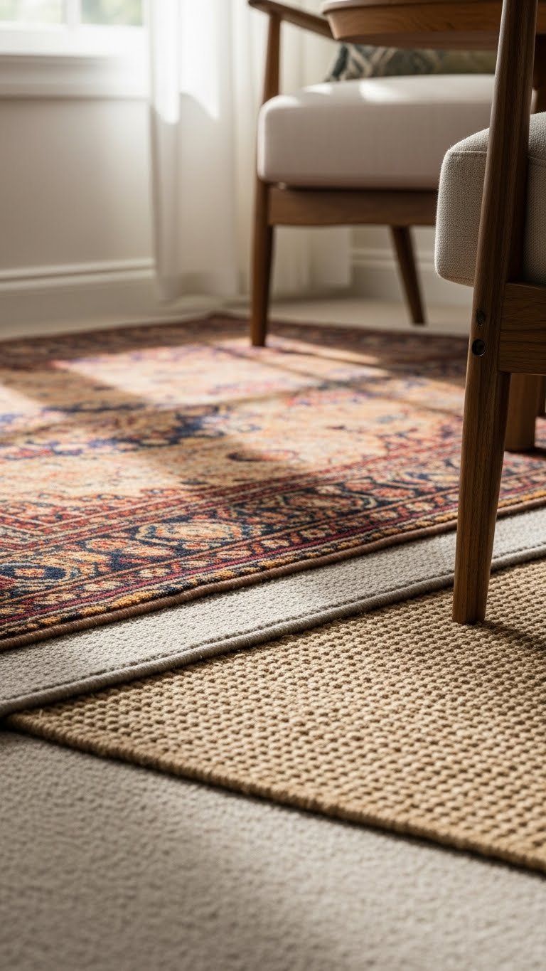 Employ jute layering for organic texture underfoot, anchoring seating areas and defining flow.