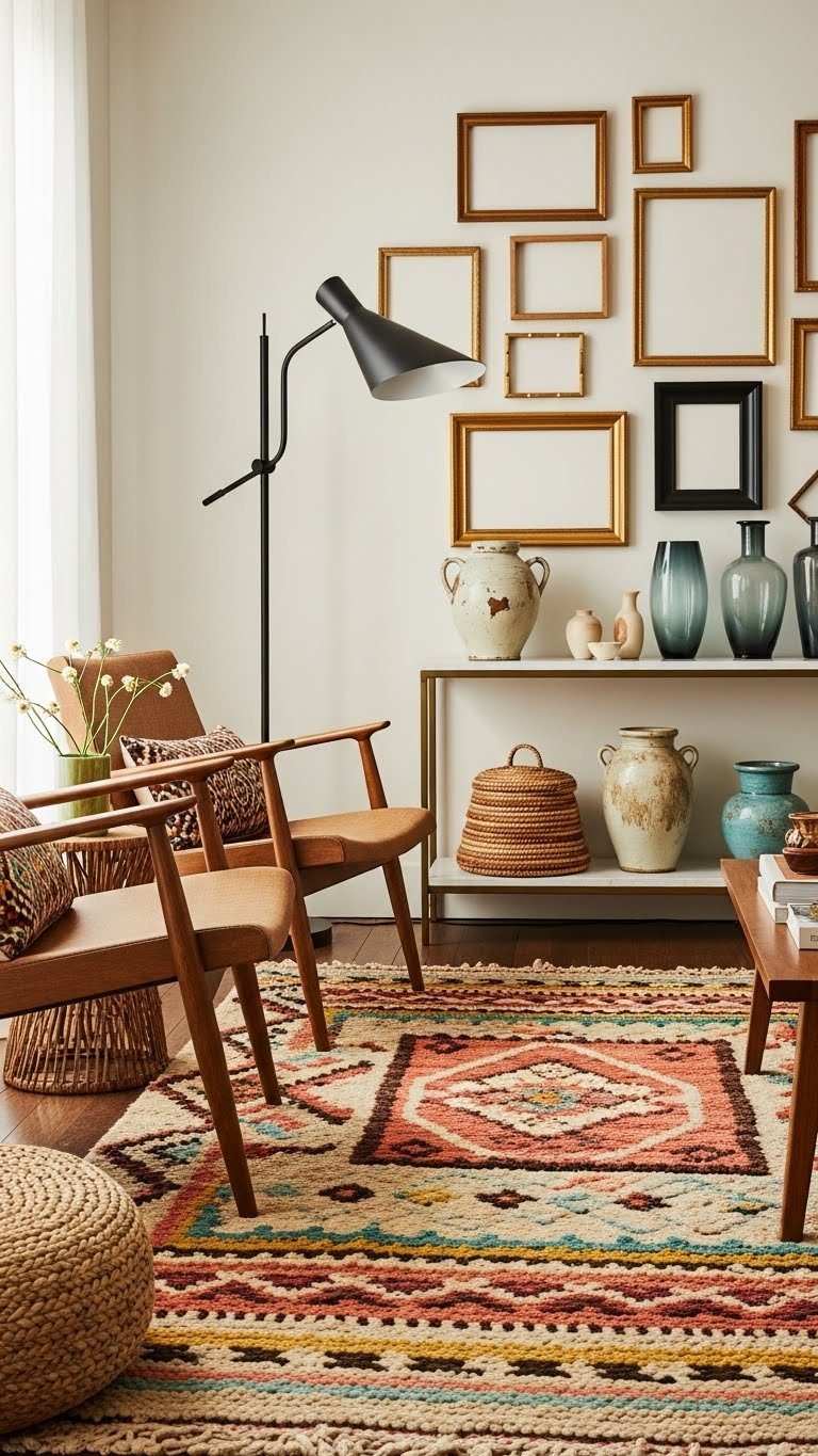 Often you’ll find that the most personal rooms come from mixing pieces that weren’t meant to match: mid-century chairs sit beside a boho rug, a gallery of mismatched frames shares a wall with a sculptural floor lamp, and heirloom ceramics mingle with modern glass.