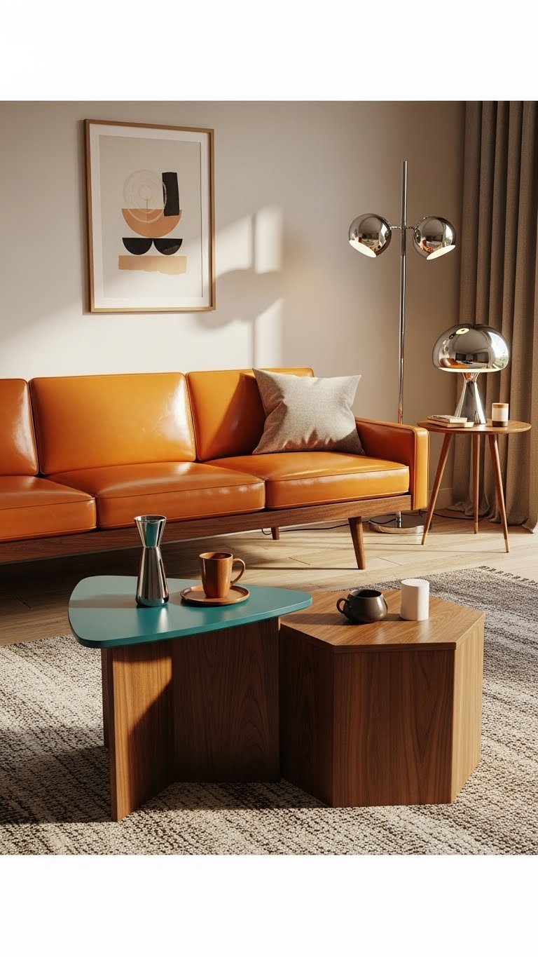 You’ll mix low-profile sofas clad in vintage vinyls with tapered wood legs, pair bold geometric side tables, and add chrome accents for spirited shine. Choose streamlined silhouettes that free movement and express individuality while staying practical and timeless.