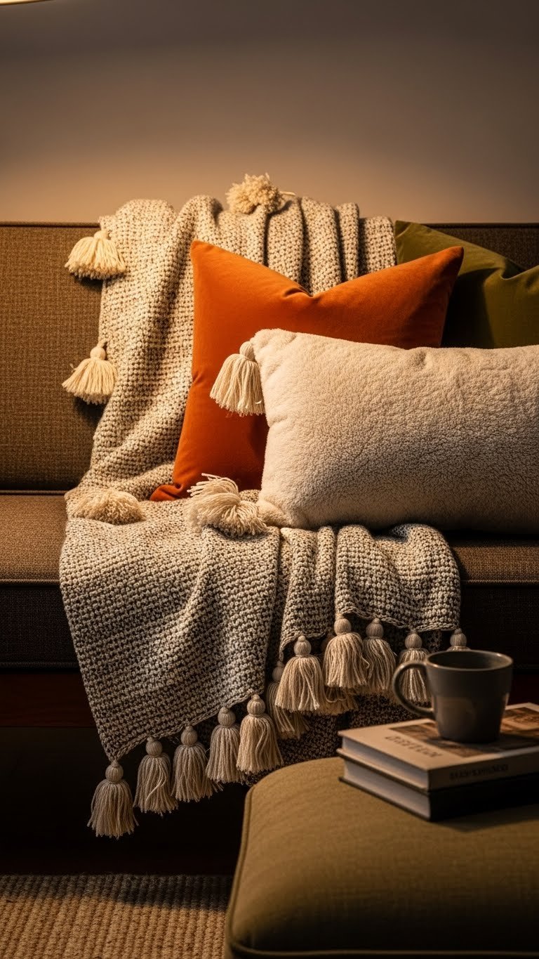 You’ll balance woven neutrals with one or two bold accents, mixing grainy weaves, subtle tassels and faux shearling cushions for tactile contrast.