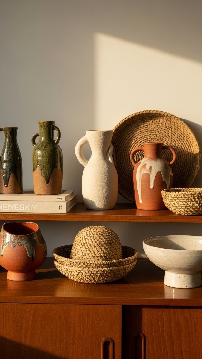 Bring in handcrafted decorative objects to anchor your retro scheme with personality and provenance. You’ll mix handmade ceramics, sculptural pieces, and woven baskets to create curated vignettes that feel lived-in, liberated, intentional.
