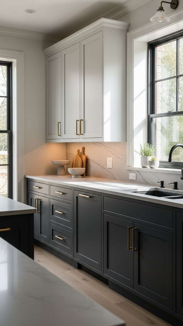 Color drenching taught you how a single hue can unify a room; applying the same principle to cabinetry gives your kitchen a similarly polished, intentional look by splitting finishes between upper and lower cabinets. You’ll create tuxedo cabinets by pairing contrast finishes — light uppers, deep lowers — and selecting bold hardware choices that feel liberated yet refined, balancing proportion, scale, and clean lines throughout.