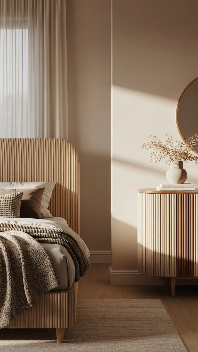 After you’ve layered soft bouclé and varied textiles, introduce fluted wood and ribbed details to add linear rhythm and sculptural warmth. You’ll balance surfaces with a fluted bedhead anchoring the bedroom and a ribbed console defining entryways.