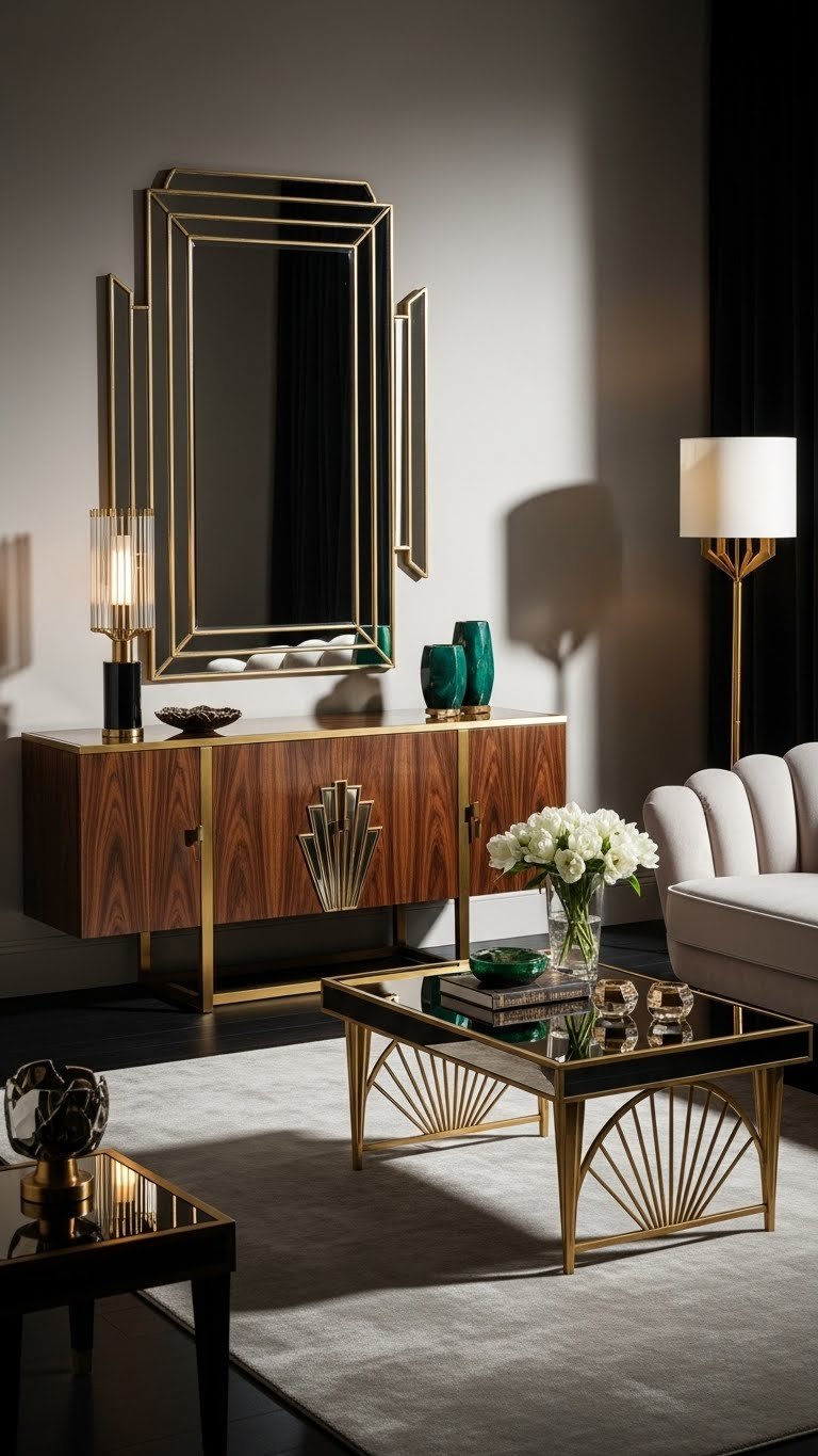 Start with a few statement pieces that channel Art Deco’s geometric glamour—think a streamlined walnut console with brass inlay, a low-profile sofa with scalloped tufting, or a mirrored cocktail table with fan-shaped legs.