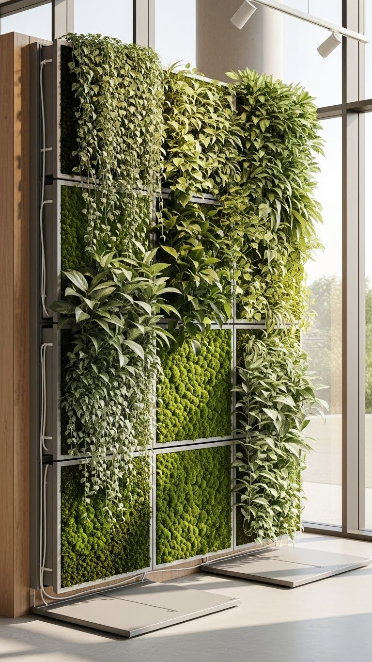 You’ll choose modular living wallkits or bespoke frames, mix trailing vines with moss panels for texture, and plan light, irrigation, and access.