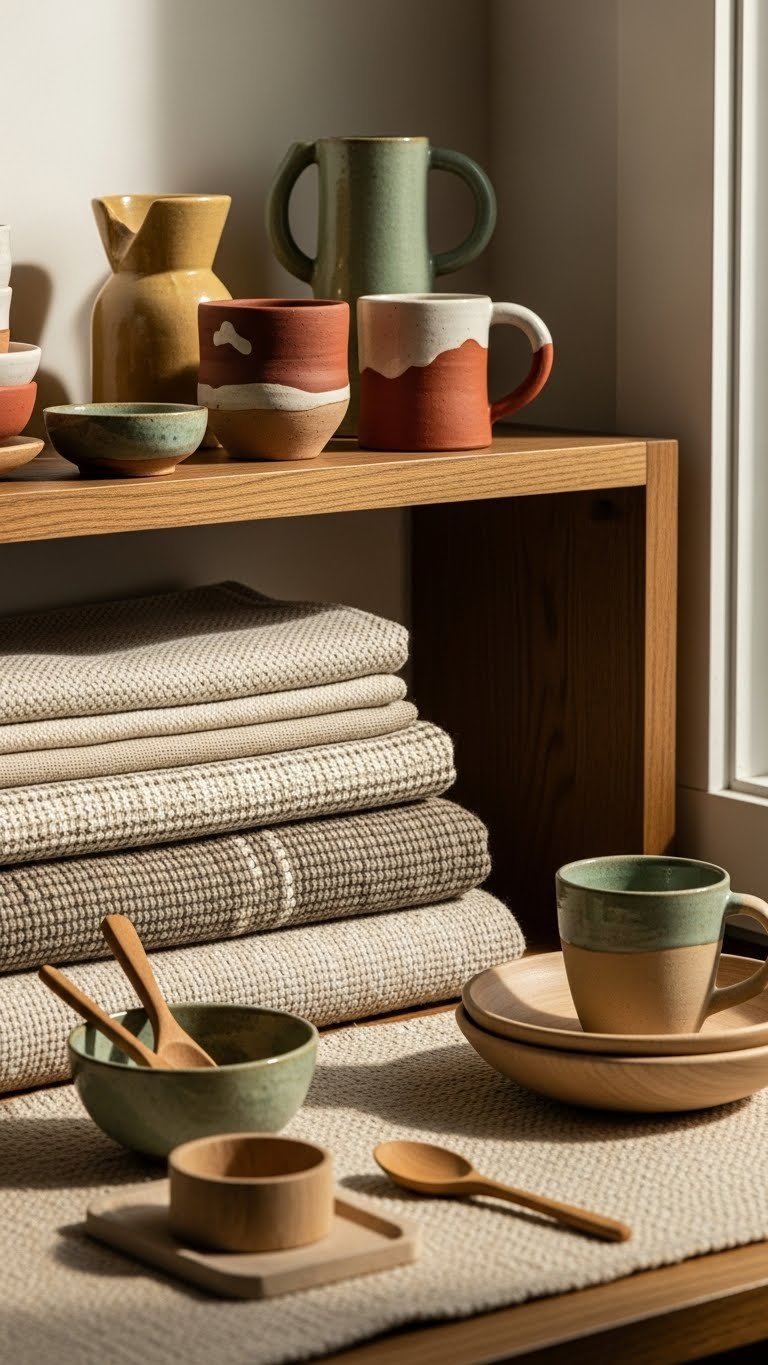 You’ll seek handmade ceramics for imperfect glazes and sculptural form, pair them with artisanal textiles for layered warmth, and curate pieces that celebrate makerly detail.