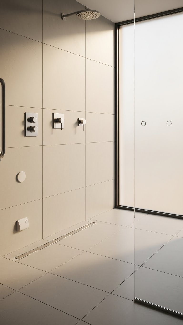 To keep that seamless, safe feeling underfoot, choose nonslip flooring that looks as refined as it performs—textured large-format tiles, matte porcelain, or stone-effect surfaces with a low-profile grit finish provide grip without shouting “safety.” Pair the floor choice with a built-in seating strategy that reads like architecture: a cantilevered bench or tiled fold-down seat aligned with the shower’s slope and drain keeps water moving away while offering a sturdy, ergonomic rest point.