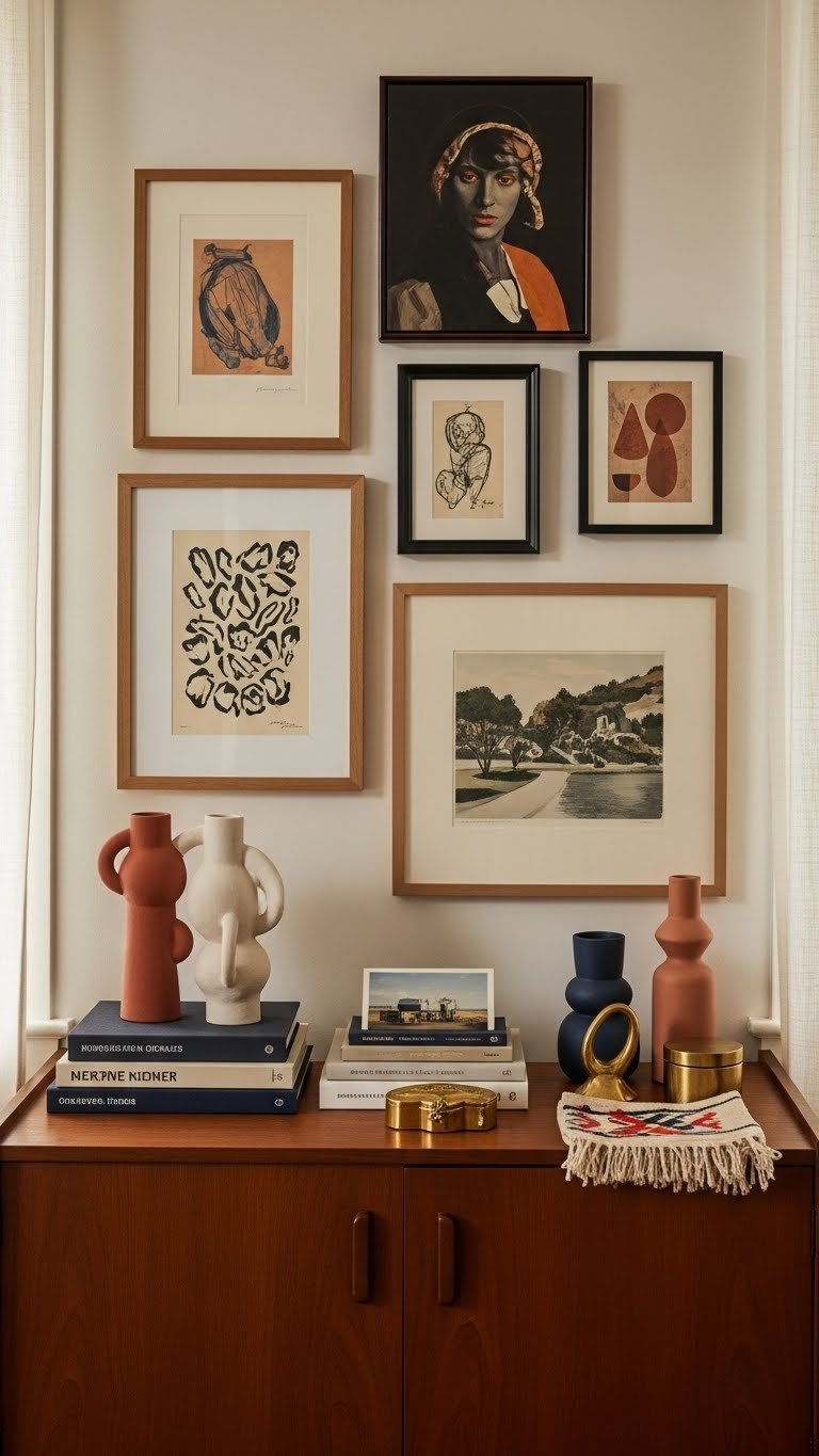Layer in personal art and one‑of‑a‑kind finds to give your rooms an unmistakable signature—mix framed prints and paintings with sculptural objects, vintage photographs, handmade ceramics, or travel keepsakes so each piece feels deliberately placed rather than tacked on.