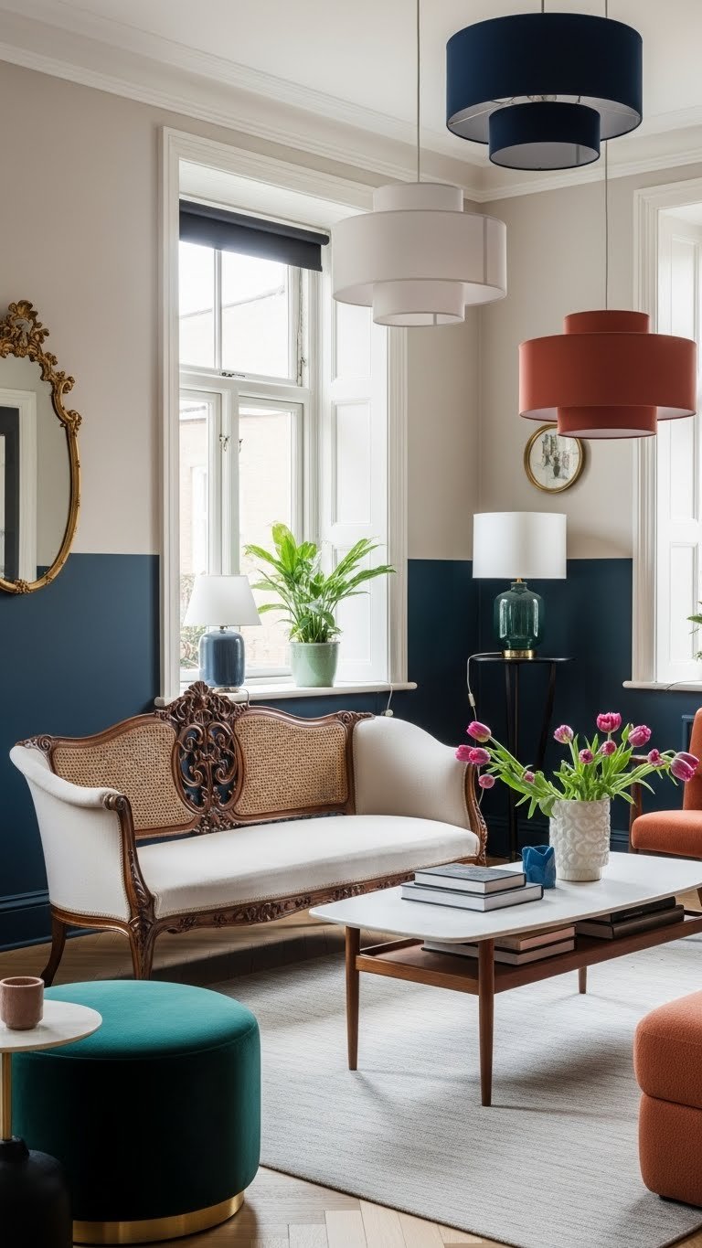 You’ll balance antique modern pieces with clean lines, pairing a Victorian minimalist silhouette with bold contemporary lighting.