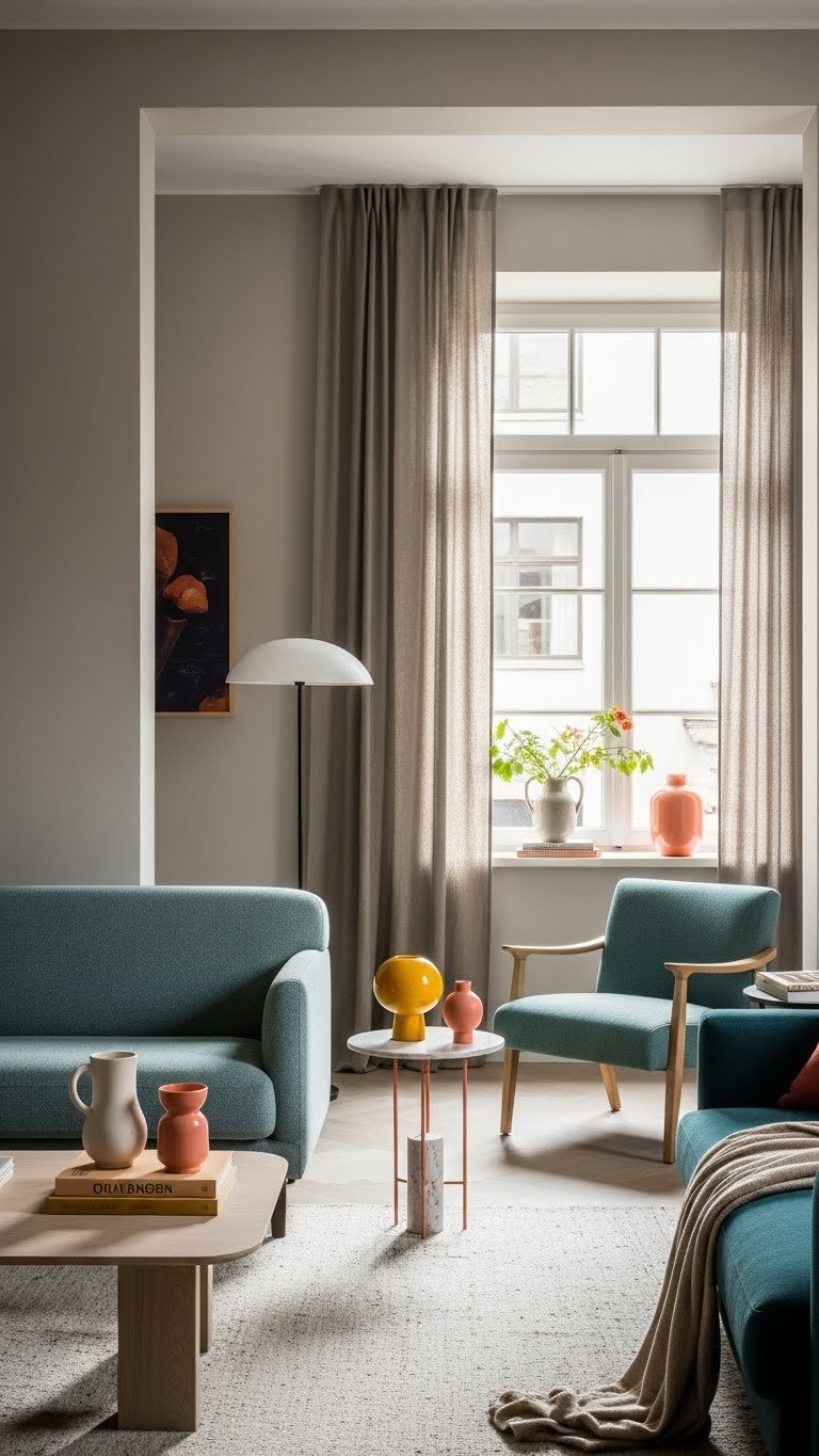 After anchoring a soft palette with one or two brutalist pieces, consider reimagining mid‑century modern selectively to keep the room feeling both fresh and timeless.