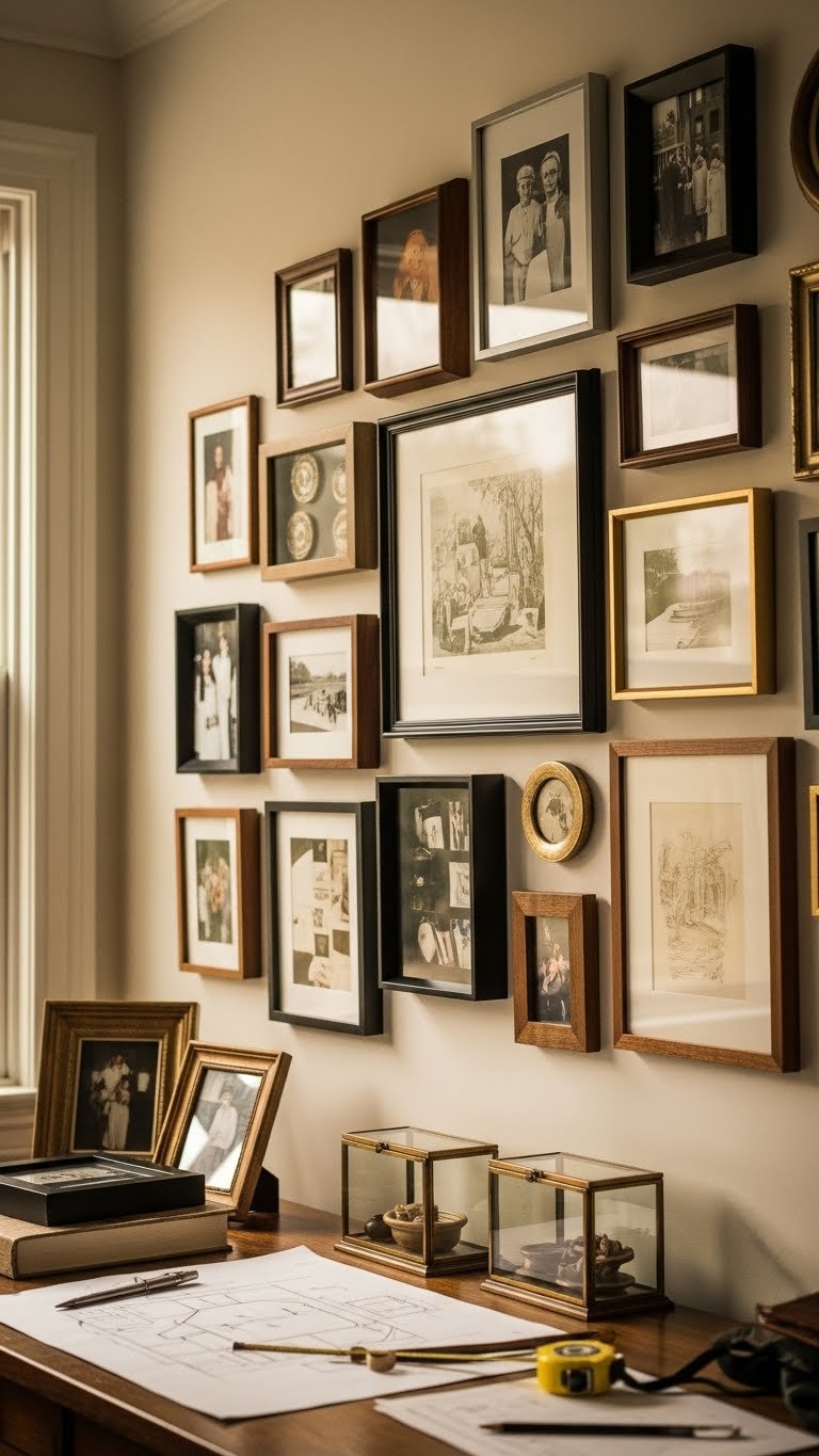A gallery wall turns scattered frames and keepsakes into a focused statement that reflects your life and style. You’ll mix photos, small objects, and varied frames for an heirloom display that feels lived-in.