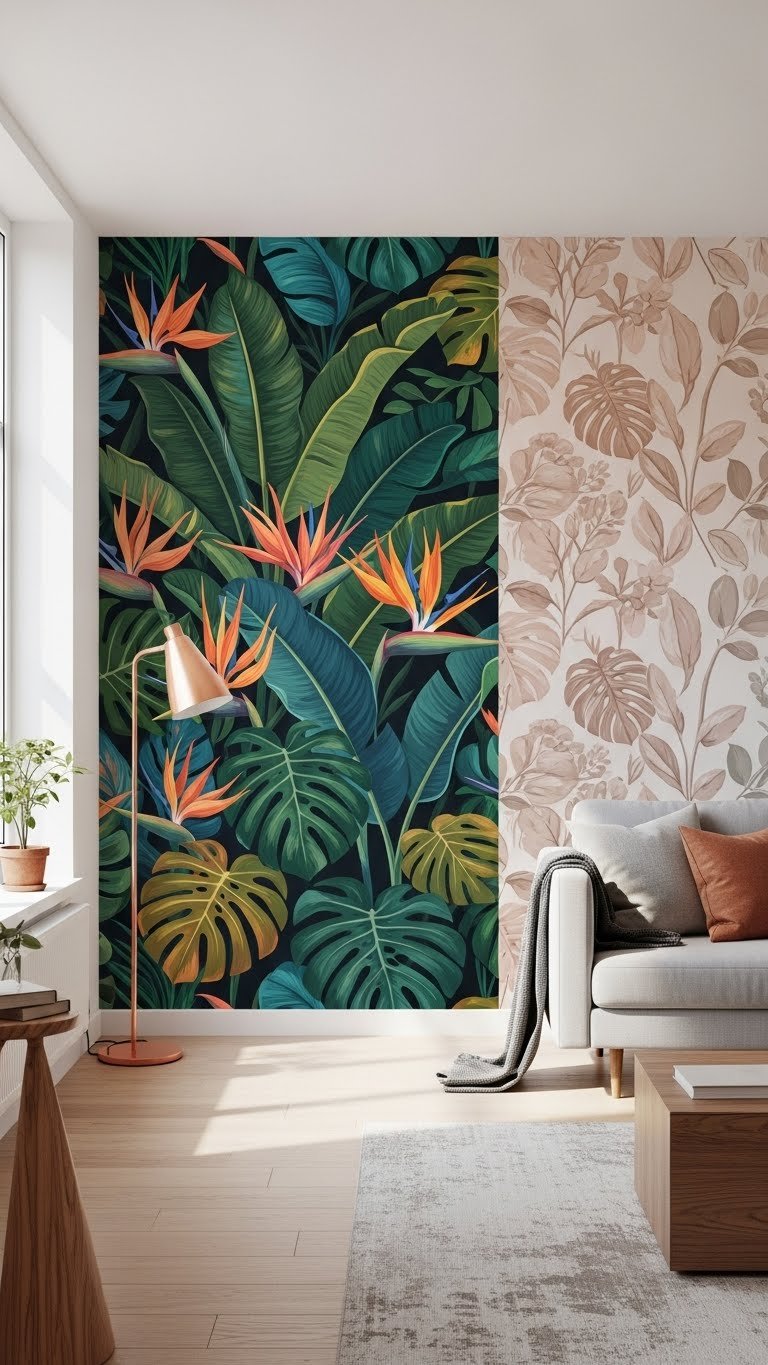 Nature-driven murals bring the outdoors in, turning an accent wall into a living backdrop that changes the room’s mood. You’ll pick bold tropical foliage for a vibrant escape or muted seasonal botanicals for calm, rotating pieces with the year. Paint or removable wallpaper lets you experiment, scale to your sofa, and keep the space feeling open, adventurous, and utterly yours.