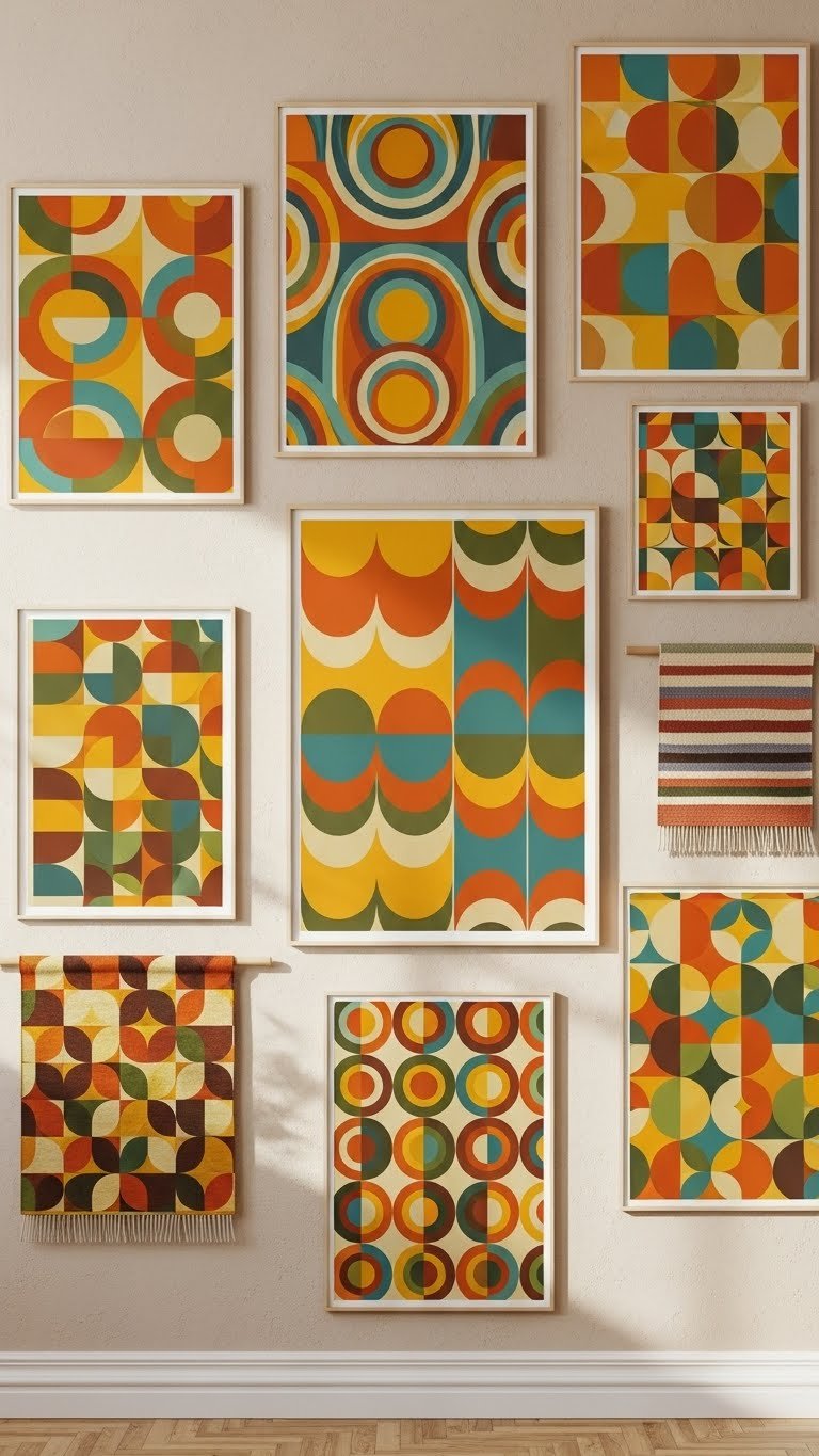 Dial in a vintage vibe with retro geometric patterned wall art that blends bold shapes, saturated colors, and rhythmic repeats to energize your living room. You’ll pick Mid century-inspired prints, Optical patterns that play with depth, and Color blocking to define seating zones. Mix framed posters with Retro textiles as wall hangings, keeping scale balanced so each piece breathes and invites movement.