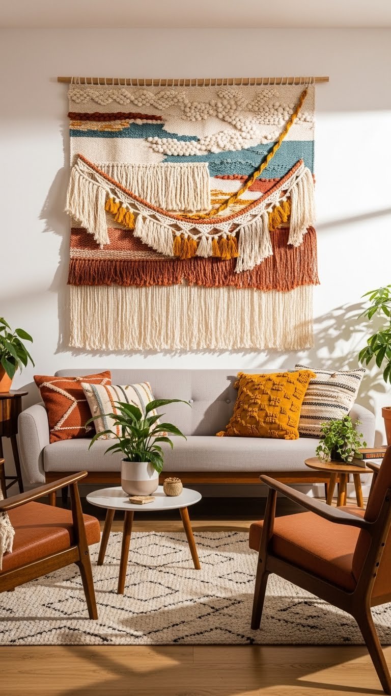 Woven tapestries and macramé wall hangings add instant texture and a handcrafted focal point to your living room, anchoring a seating area without taking up floor space. Choose handwoven fiberwork or bold bohemian knots to express freedom and soften hard edges. Hang it centered over a sofa or niche, vary scale for drama, and swap pieces seasonally to keep the space feeling adventurous.