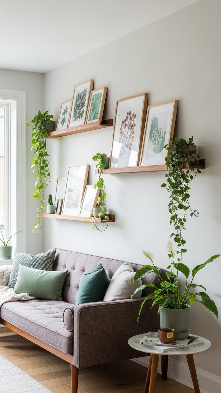 Float a set of slim floating shelves above your sofa to create a layered display of art and greenery that doesn’t crowd the floor. You’ll mix framed prints on art led shelves with potted, trailing floating botanicals to keep the look airy. Vary heights, rotate pieces, and leave negative space so the arrangement feels free, lived-in, and easy to rearrange.