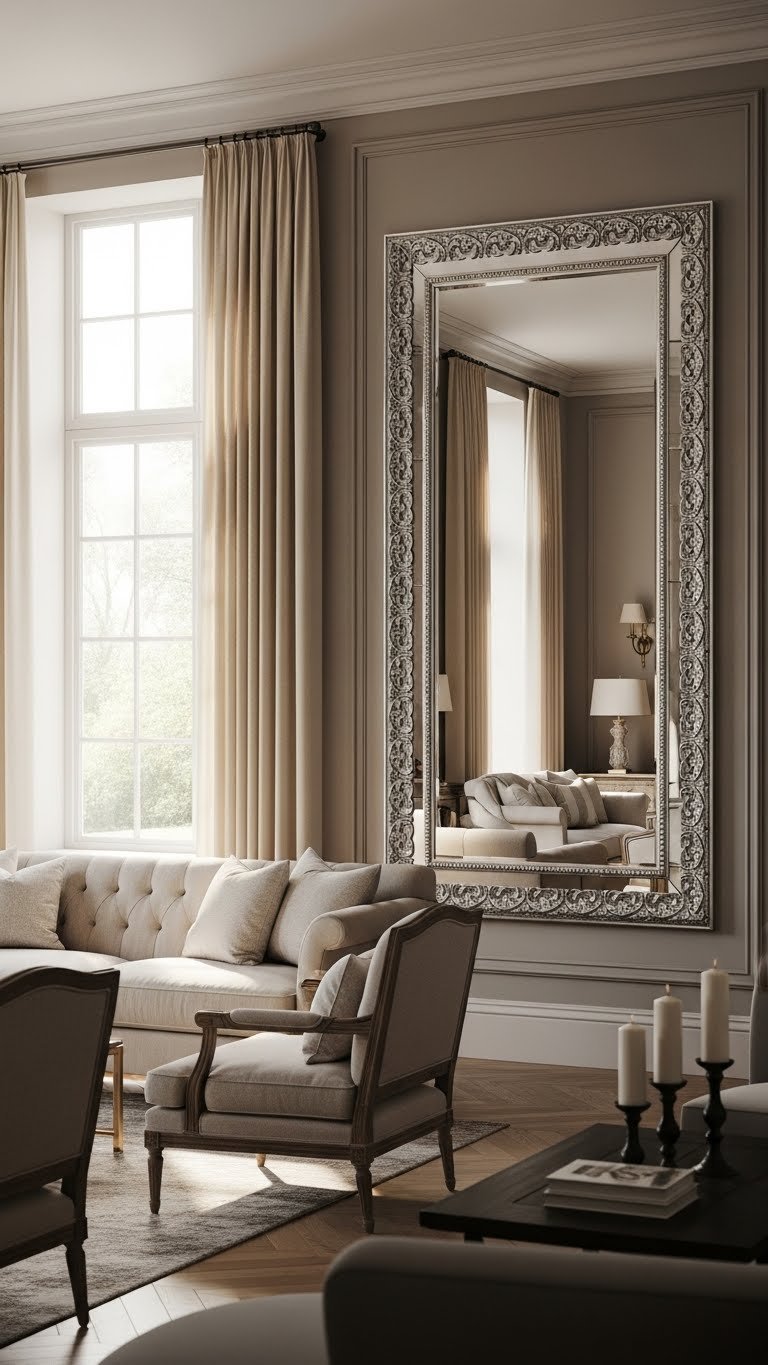 Because a large, framed mirror reflects light and sightlines, it instantly makes a living room feel larger and more open; place it opposite a window or adjacent to a seating grouping to double daylight and expand views.
