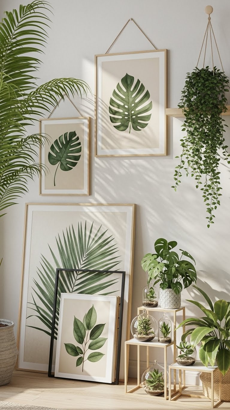 You’ll create leafy vignettes by grouping framed studies with floor palms, hanging philodendrons, and small terrarium pairings on shelves.