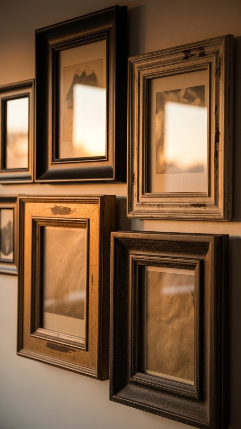 Though slightly weathered, a group of distressed frames brings a warm, nostalgic anchor to your wall—arrange mismatched sizes and finishes in a loose cluster so each frame reads like a found object rather than a match set. Use aged glass, chipped patina, sepia prints and subtle hand distressing to evoke stories. Leave negative space, vary heights, and hang securely for an effortless, liberated look.