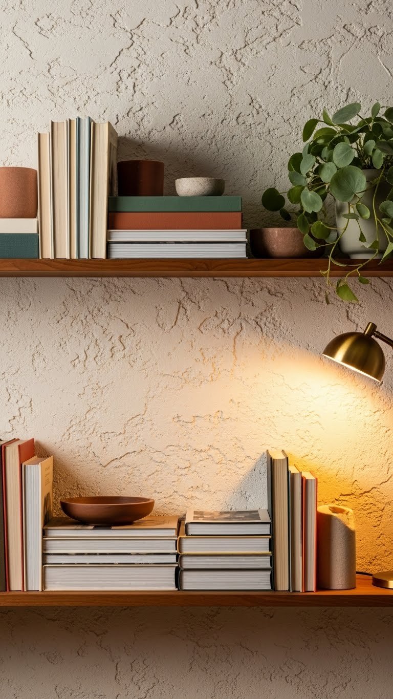 Once your wall has that sculptural depth, create a curated shelf that complements the texture without competing with it. You’ll arrange bookstack symmetry—tall stacks balanced by low piles—mixing spines and horizontal layers.