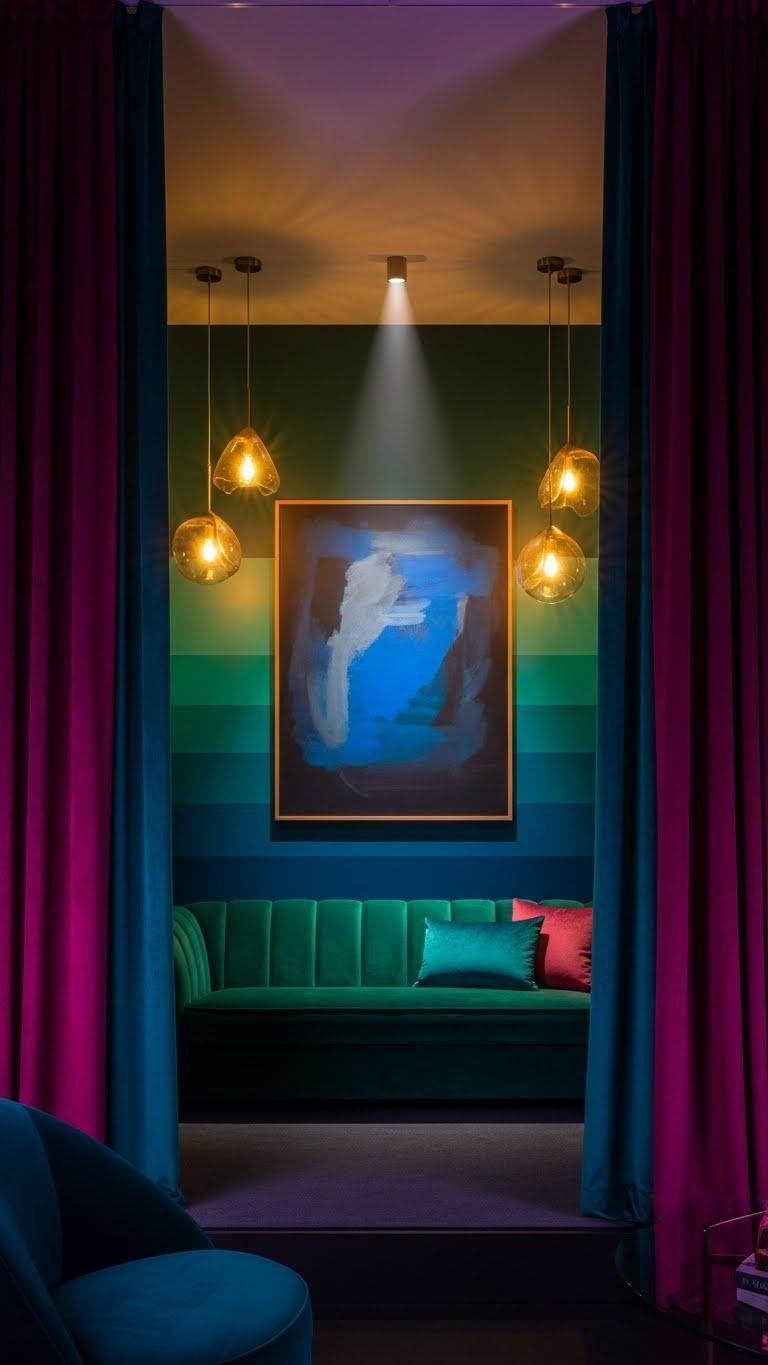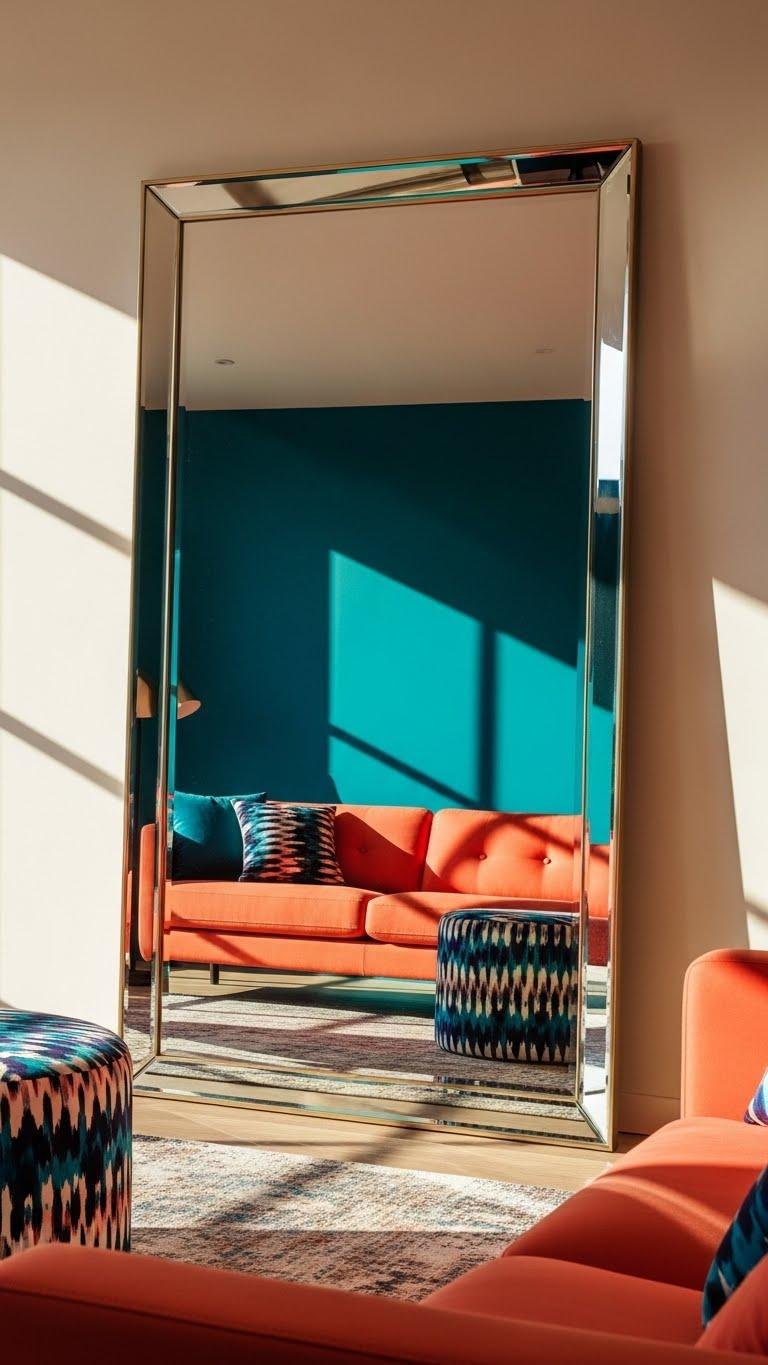 Bring in an overscaled mirror and watch colors double and intensify—large reflective surfaces bounce saturated hues around the room, turning a single accent wall or statement sofa into a chorus of color.