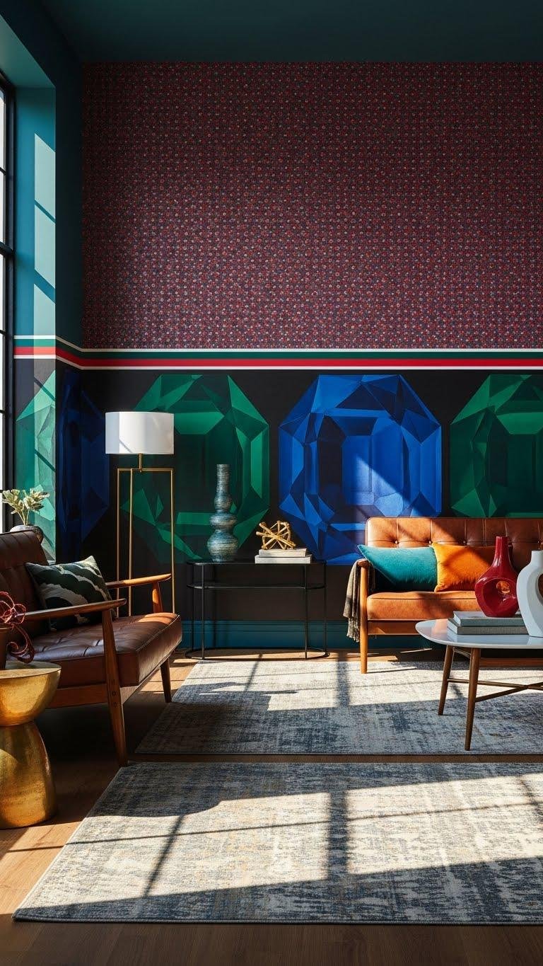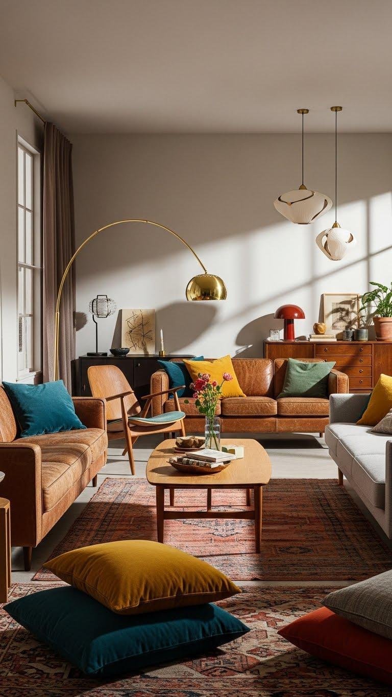 Let Midcentury contrasts anchor seating and lighting while you introduce bold textiles and liberated color.