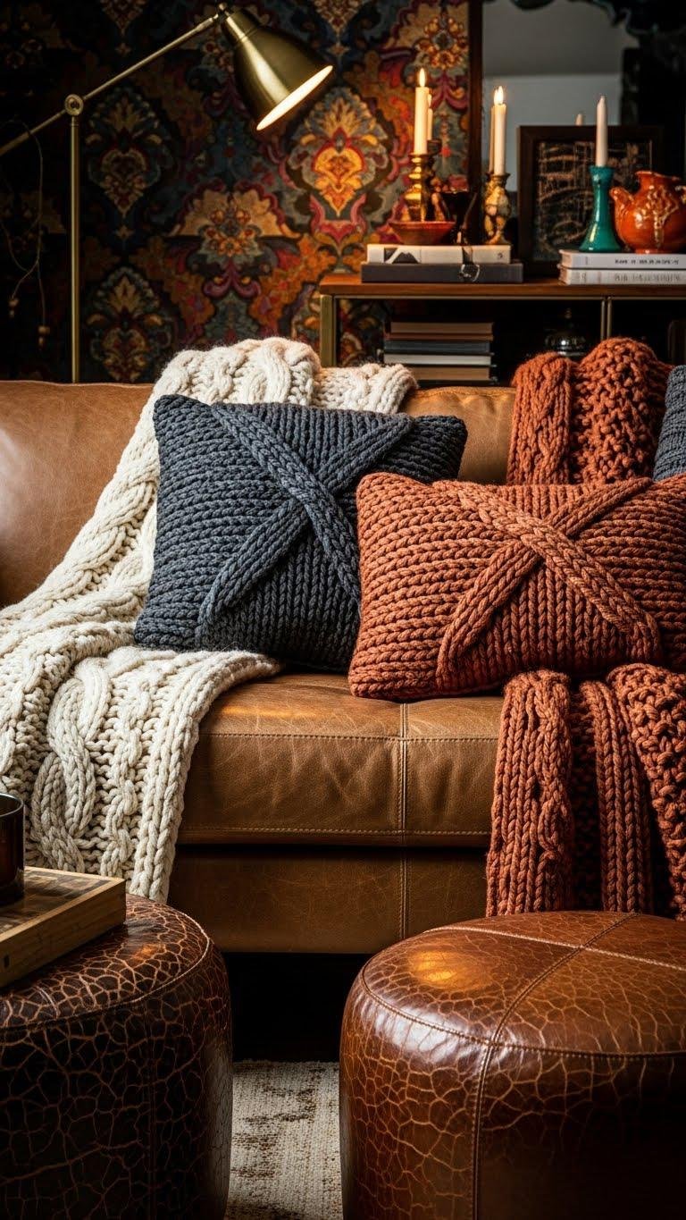 Layer sumptuous leathers with chunky knits to create a tactile dialogue that grounds maximalist rooms without dulling their drama. You’ll use leather layering to anchor bold color and pattern, pairing aged hides with glossy finishes for contrast. Add knit accents—oversized throws, sculptural cushions—to soften edges and invite touch. Trust texture to balance excess, letting your space feel liberated, deliberate, and fiercely tactile.