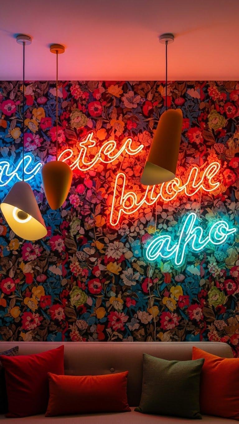 After you’ve set up a confident pattern play with florals and geometrics, add neon signs or whimsical light fixtures to give the room a shot of personality and modern edge. You’ll use neon typography to declare mood and playful pendants to sculpt atmosphere.