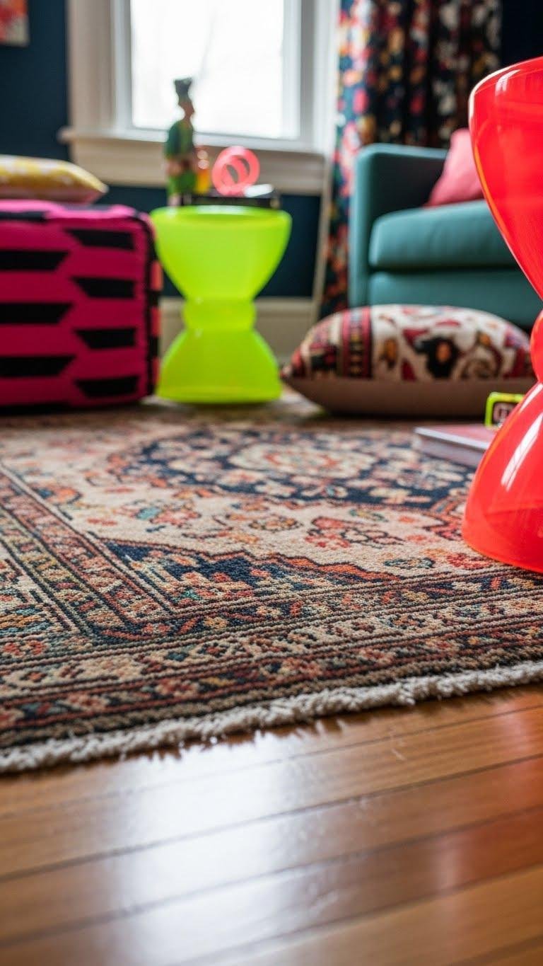 Layering an antique rug over hardwood instantly grounds a maximalist room with history and texture, letting you balance bold patterns and neon accents with something soulful and worn-in. You’ll choose pieces that flaunt antique knotting techniques, vivid dyes and subtle wear. Follow patina preservation tips: rotate, pad, and spot-clean gently so your rug ages with character while your space stays free and fearless.