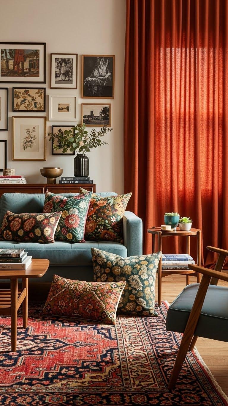 You’ll want to push past safe neutrals and let rooms feel unapologetically collected and theatrical. Start with jewel-toned walls or layered wallpapers, mix vintage finds with modern lines, and pile textures, patterns, and objects so every corner tells a story. I’ll show practical ways to balance scale, color, and clutter so your home reads like a confident, magazine-worthy statement—next, learn how to make each choice feel deliberate.