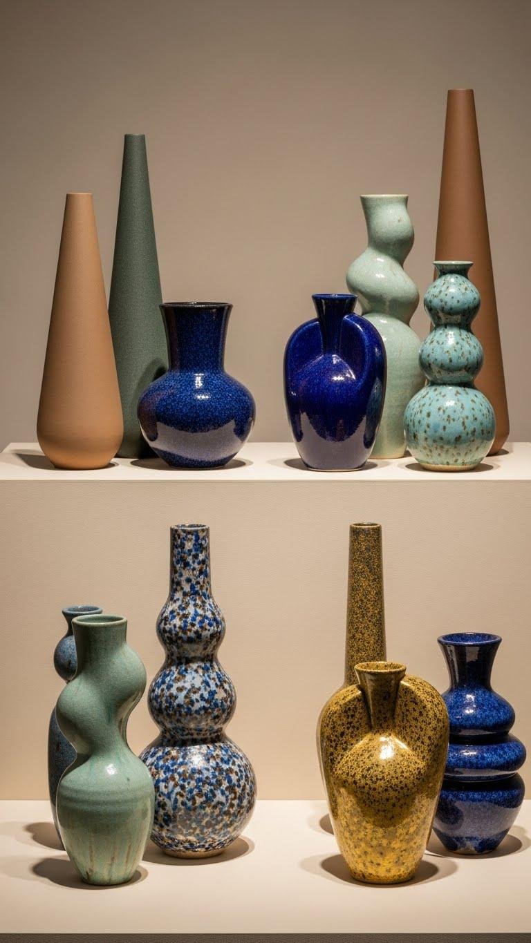 Lean into the sculptural power of ceramics and let vases do the talking: choose pieces with confident silhouettes, surprising glazes, and tactile surfaces that read like small-scale architecture rather than mere containers. You’ll curate textured ceramics and abstract sculptures as focal points, arranging them in clusters or solitary statements. Mix matte and glossy finishes, play with scale, and let bold forms declare your space’s fearless personality.